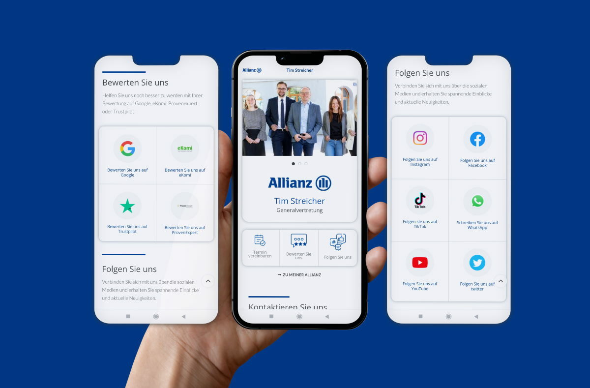 Sie als Allianz Partner:in vertreten die Werte der Allianz direkt bei Ihren Kund:innen vor Ort und genießen ein hohes Maß an Vertrauen. Wir helfen Ihnen dabei, dieses Vertrauen auch nach außen zu tragen.