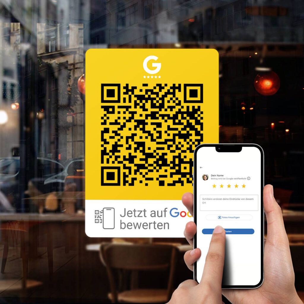 Die Google Aufkleber helfen dir ganz einfach Google Bewertungen von deinen Kunden zu erhalten, indem Du die Aufkleber prominent platzierst. Sehen Kunden diesen Aufkleber, müssen sie lediglich die Smartphone Kamera über den QR Code halten und schon gelangen sie zum Bewertungsformular von Google My Business.