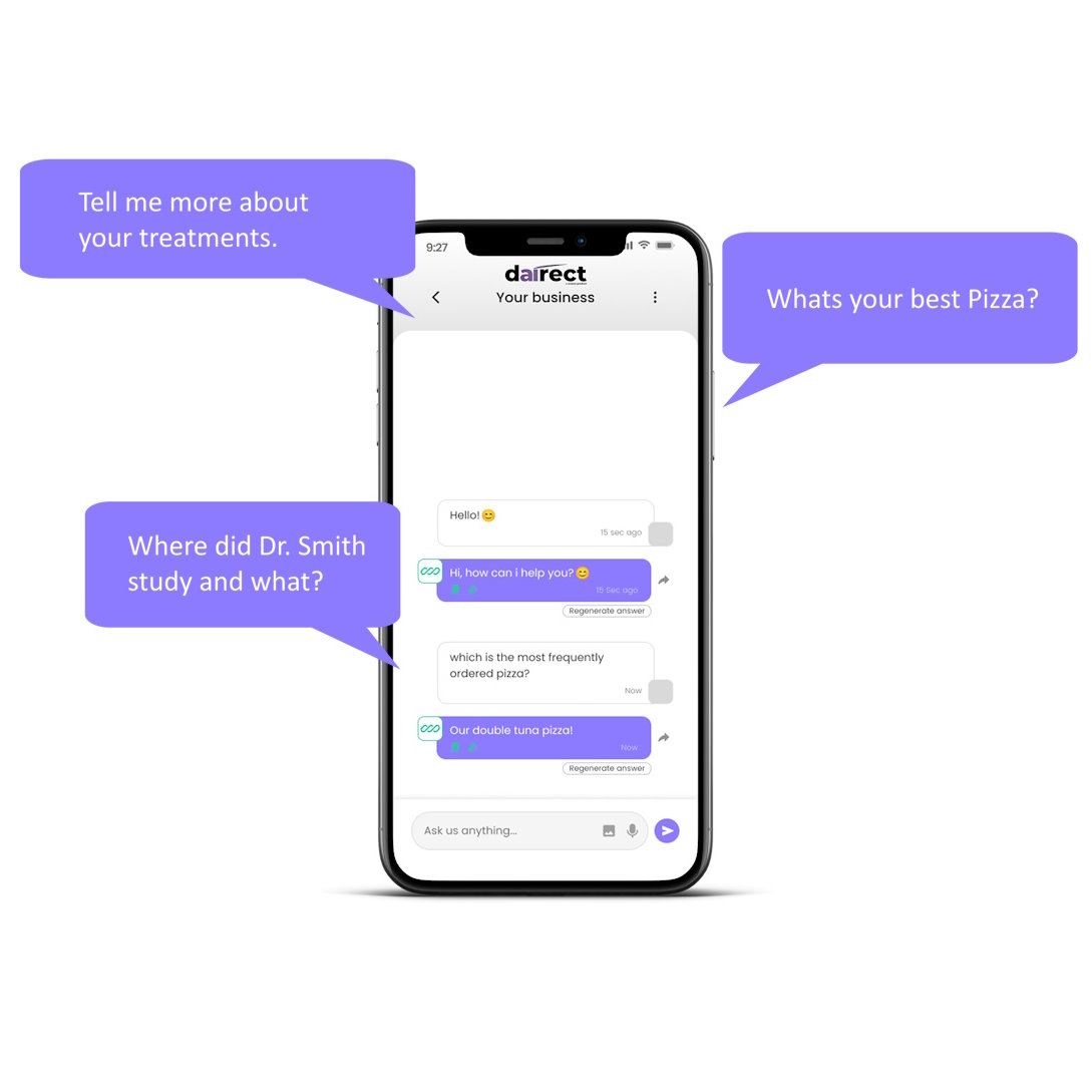 „Ich möchte euch bewerten“, „Wo kann ich euch folgen?“, „Gibt es aktuelle Angebote?“ – Kunden haben tausende Fragen – mit dairect hast Du 1001 Antwort immer zur Hand und zwar nur einen Phone Tap von Deinen Kunden entfernt.