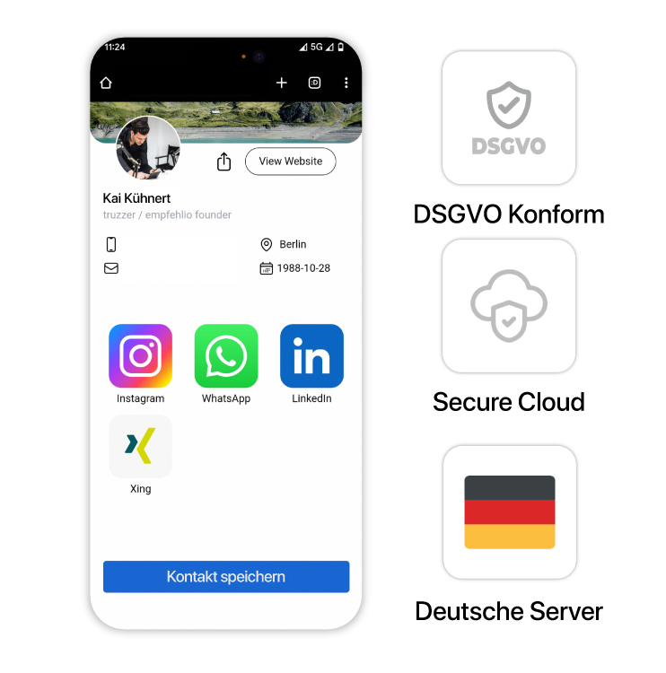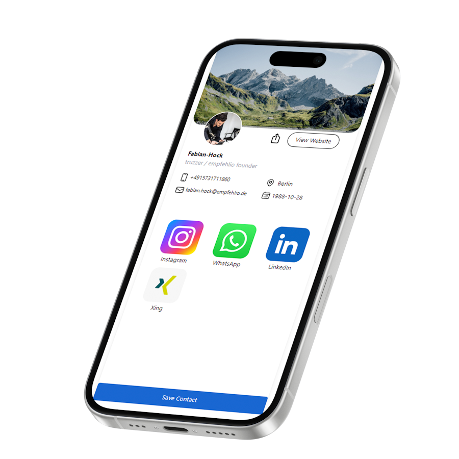 Teile alle Kontakinformationen direkt und lass dein Gegenüber diese mit einem einzigen Klick in den Kontakten speichern, inkl. aller Kontaktinformationen und Links.