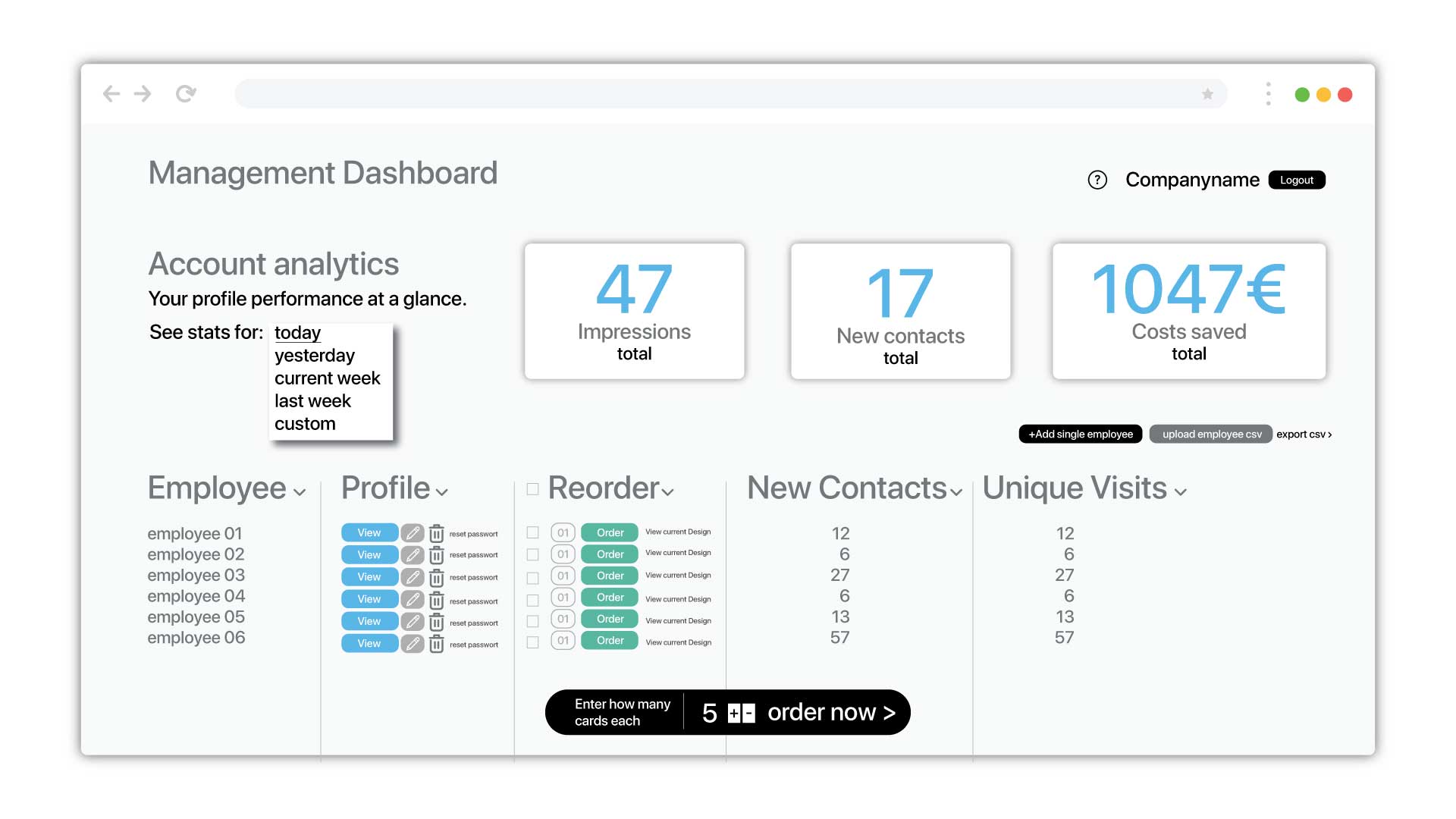 Ob Performance Messung, Profilanpassung oder Nachbestellung. Mithilfe des Management Dashboards lassen sich alle Mitarbeiter und Team Profile sowie Karten einfach verwalten.