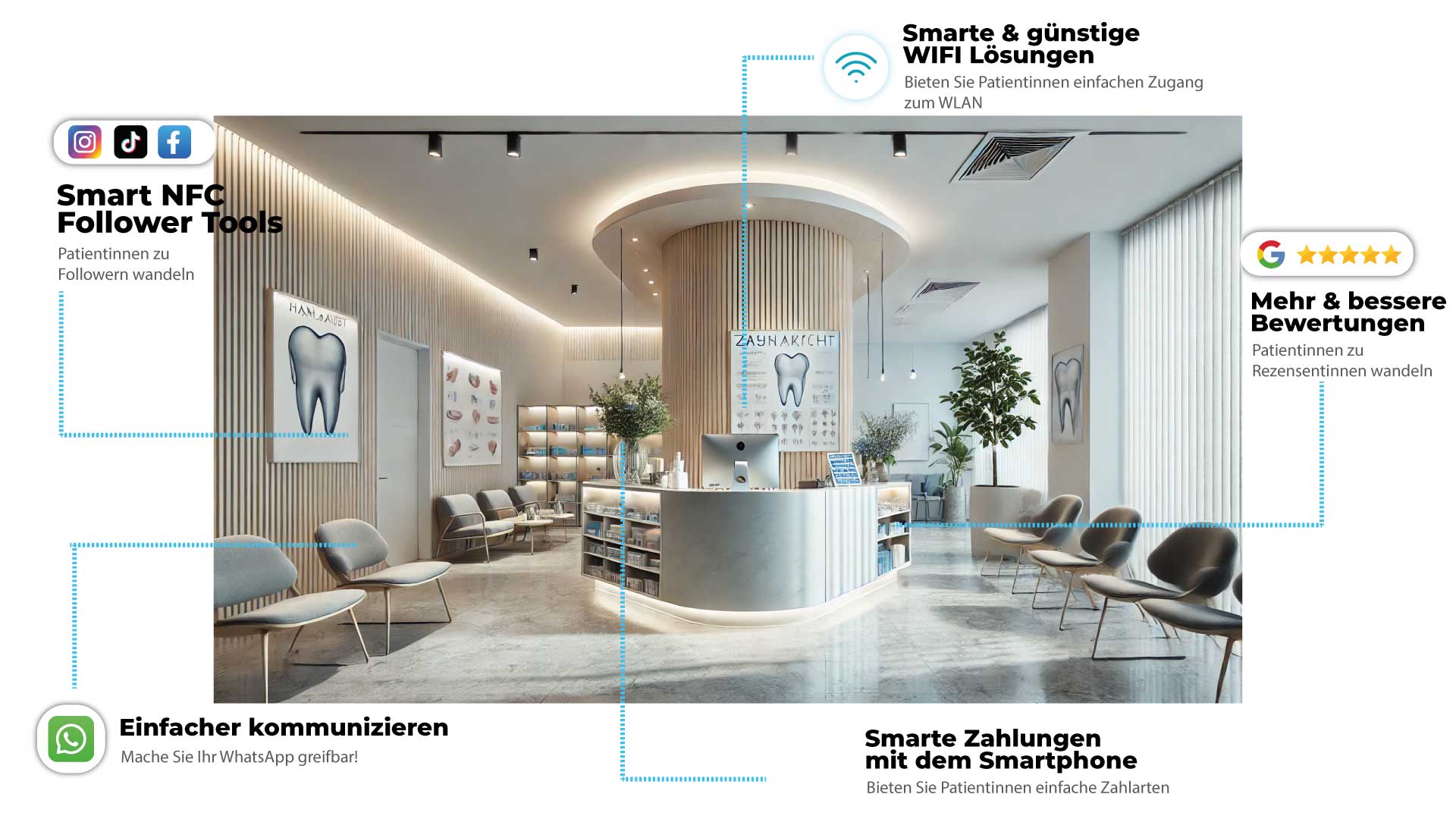 In einer modernen Zahnarztpraxis ist es nicht mehr nur wichtig, medizinische Exzellenz zu bieten, sondern auch eine nahtlose und bequeme digitale Erfahrung für Patienten zu schaffen. Mit unseren innovativen NFC- und QR-Code-Produkten ermöglichen wir Zahnärzten und Zahnarztpraxen, die Digitalisierung voranzutreiben und gleichzeitig die Patientenzufriedenheit und Bindung zu steigern.