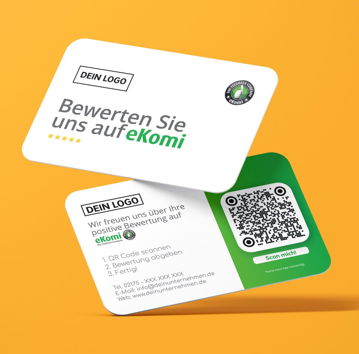 Die „Bewerte uns auf eKomi“ Produkte sind allesamt individuell auf Dein Unternehmen zugeschnitten und werden mit deinem Logo, wie auch deinem eigenen eKomi Bewertungs QR Code personalisiert, welchen wir für dich erstellen.