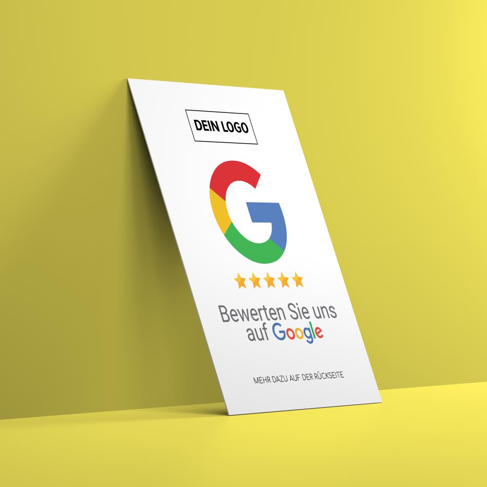 Die „Bewerte uns auf Google“ Produkte sind allesamt individuell auf Dein Unternehmen zugeschnitten und werden mit deinem Logo, wie auch deinem eigenen Google Bewertungs QR Code personalisiert, welchen wir für dich erstellen.