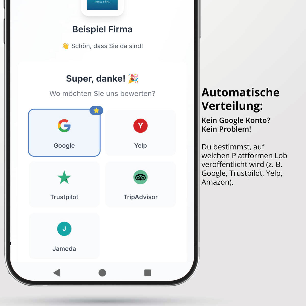 Automatische Verteilung: Du bestimmst, auf welchen Plattformen Lob veröffentlicht wird (z. B. Google, Trustpilot, Yelp, Amazon). So können Dich Kunden auch bewerten, wenn sie kein Google Konto haben.