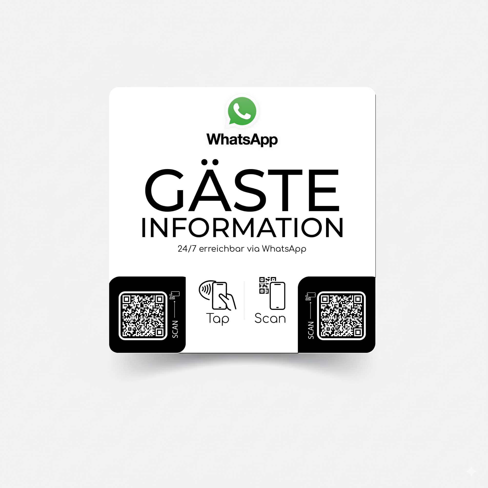 Der Gästeinformation WhatsApp Smart Sticker mit NFC & QR-Code macht die Kommunikation mit Gästen so einfach wie nie. Kein Suchen nach Telefonnummern, kein Abtippen – deine Gäste können dich sofort erreichen.