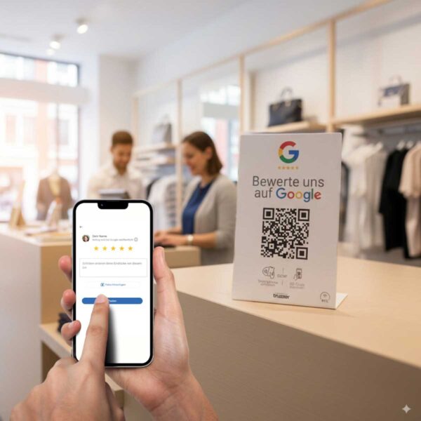 - Kein unangenehmes Fragen & Bitten, einfach vor Ort platzieren. Der Call-To-Action übernimmt die Bitte um eine Google Bewertung für Dich