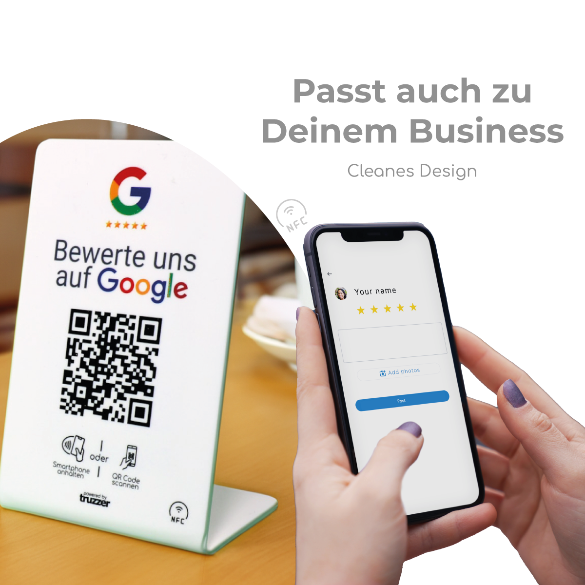 Der Google Bewertung NFC Aufsteller Display ist das Original – entwickelt von Empfehlio und weltweit tausendfach im Einsatz. Er kombiniert elegantes Design mit modernster Technologie und macht es Deinen Kunden so einfach wie nie, eine echte Google-Bewertung abzugeben. Einfach Smartphone an den Aufsteller halten oder den QR-Code scannen – und schon landet der Kunde direkt auf Deiner Bewertungsseite.