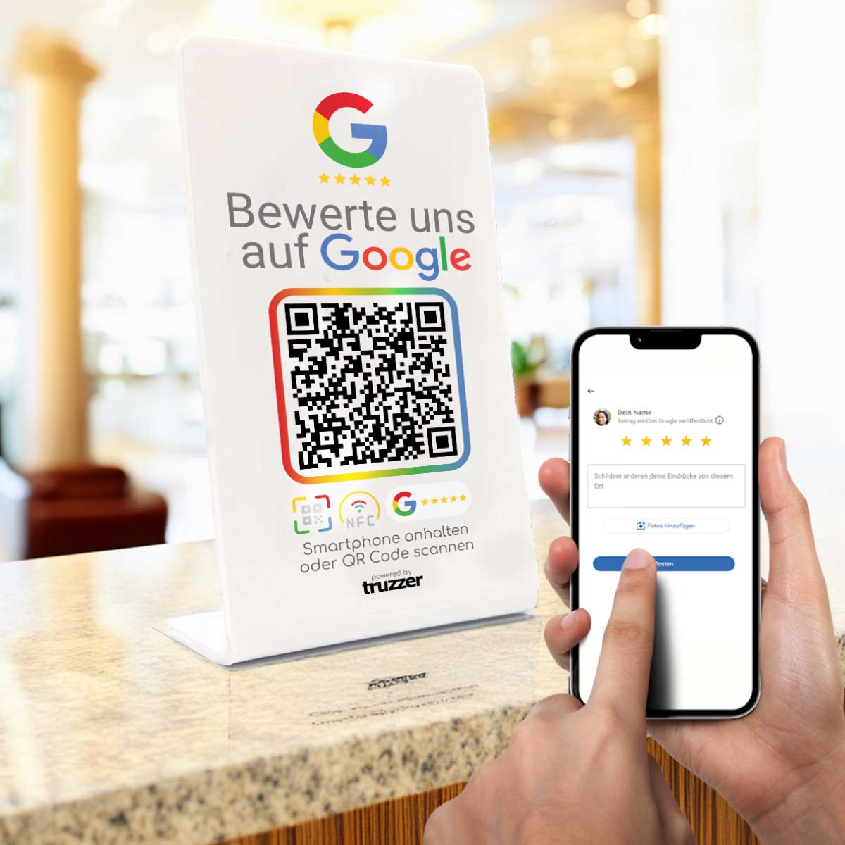 Der Google Bewertung NFC Aufsteller EVO ist die moderne Lösung, um Kundenfeedback direkt und unkompliziert zu erhalten. Durch die Kombination aus NFC-Tag und QR-Code führst du deine Kunden ohne Umwege direkt zur Google-Bewertung.