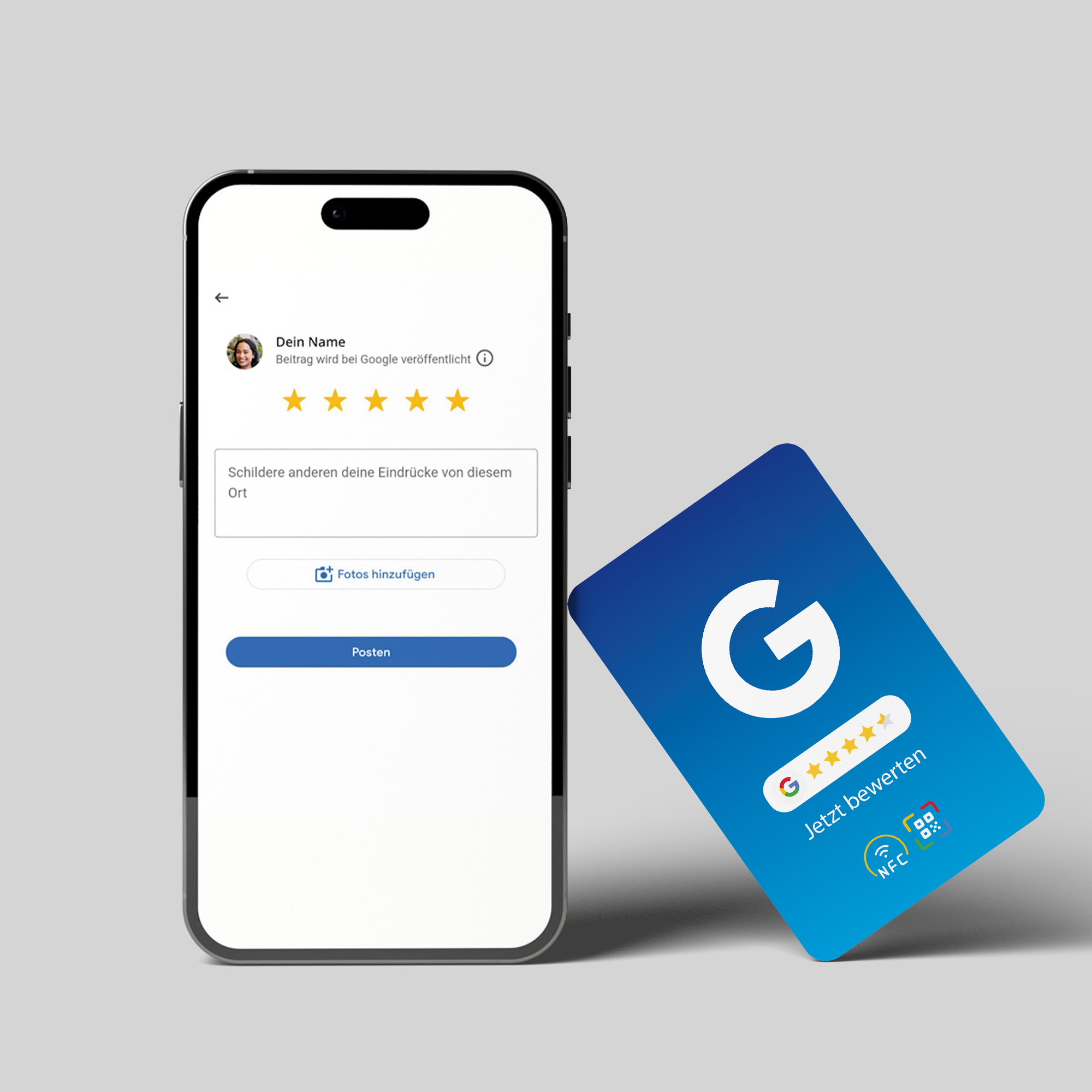 Die Erstellung und Verlinkung des NFC Links, sowie des QR-Codes zur direkten Bewertung auf deinem Google Profil übernehmen wir für dich!