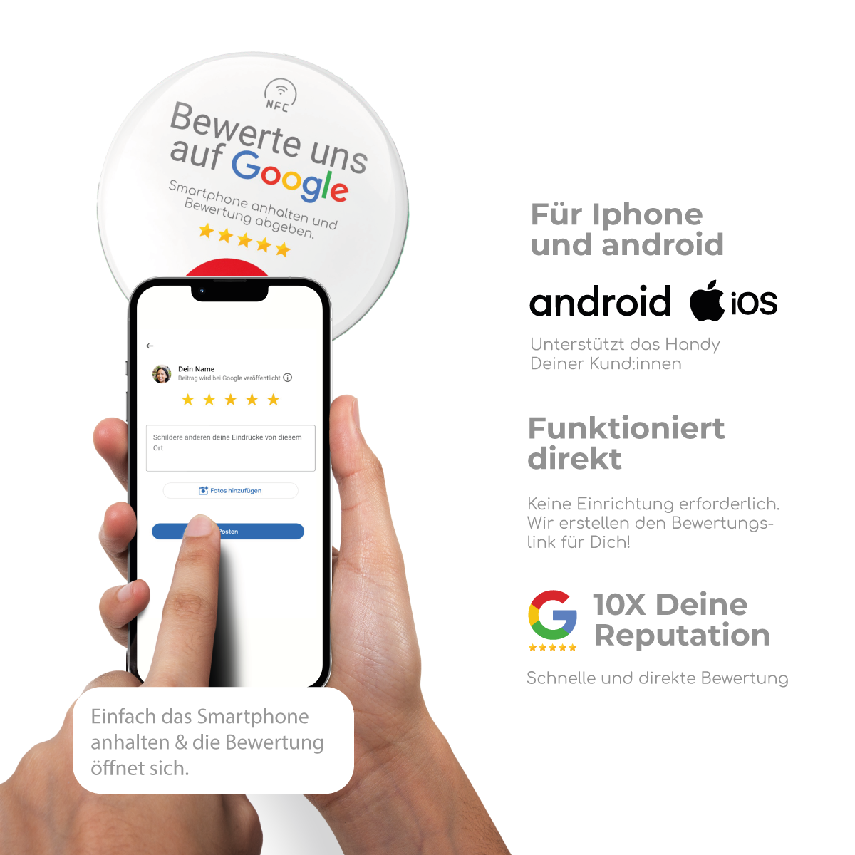 Alles, was Deine Kund:innen tun müssen, ist das Smartphone an den Action Button zu halten und schon öffnet sich die direkte Google Bewertung auf dem Smartphone deiner Kund:innen – ohne suchen, ohne bitte, ohne fragen.