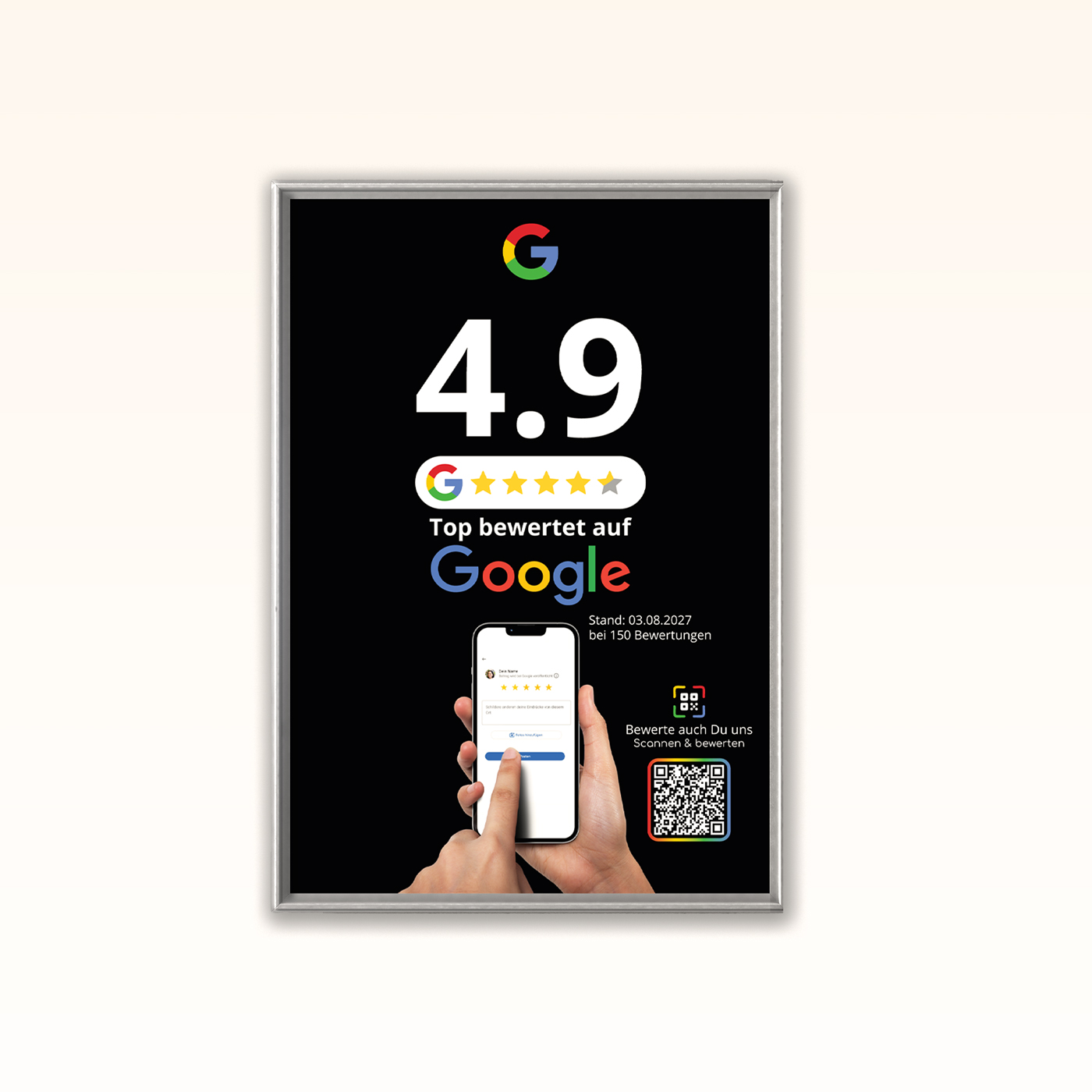 Zeige Deine Google Bewertungen großformatig im Geschäft – und ermögliche Kunden mit einem Scan, sofort selbst eine Bewertung abzugeben.