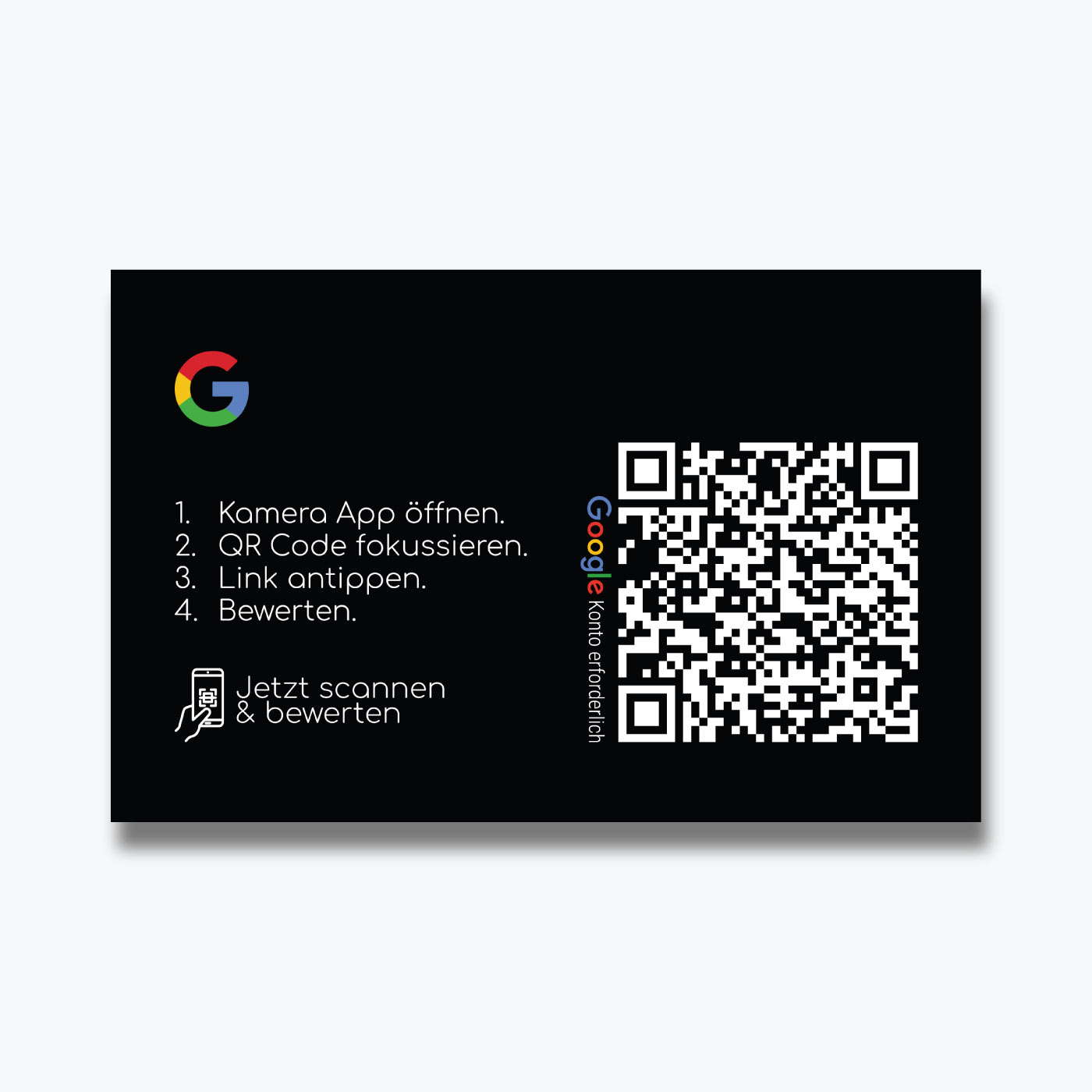 In Weiß oder Schwarz erhältlich, mit integriertem QR-Code zur Google-Bewertungsseite.