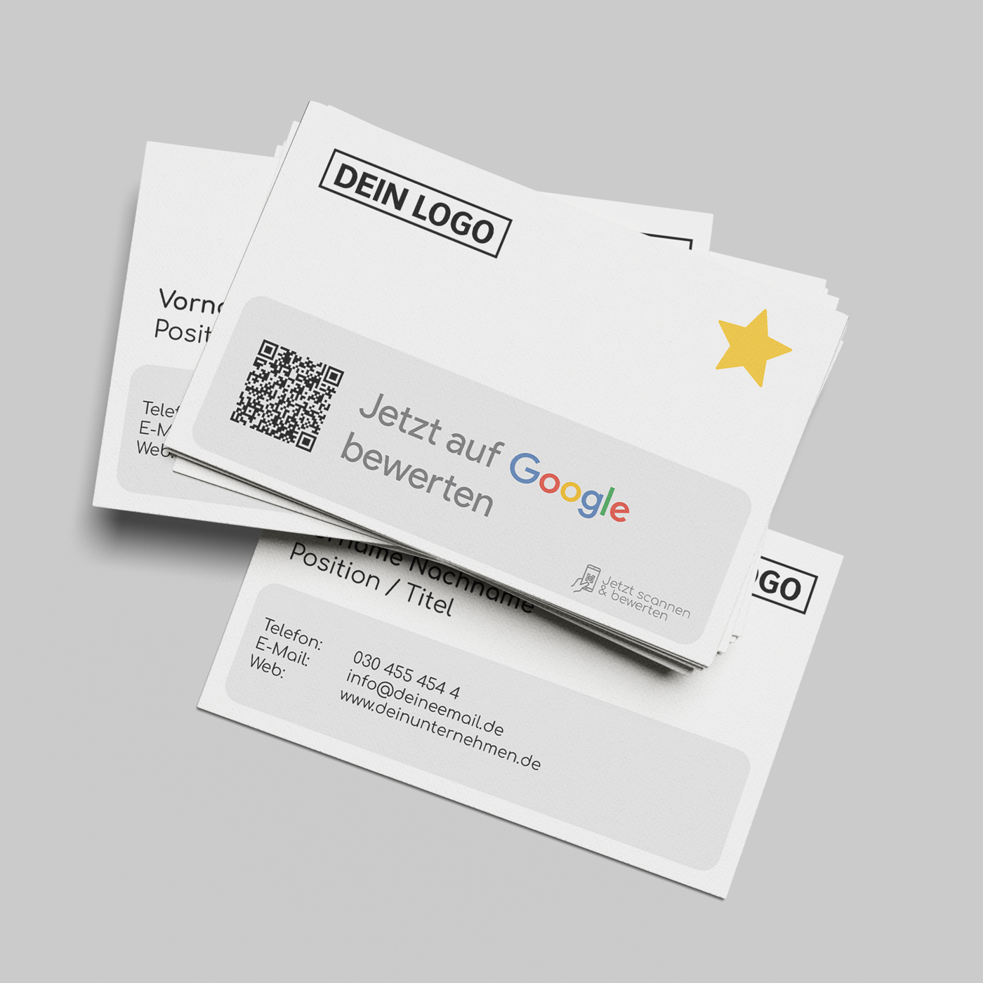 Jede Karte ist im hochwertigen Corporate Design gestaltet und enthält einen individuellen QR-Code, über den Kunden direkt deine Google-Bewertungsseite erreichen. So sammelst du unkompliziert neue Rezensionen und stärkst gleichzeitig dein Unternehmensimage.