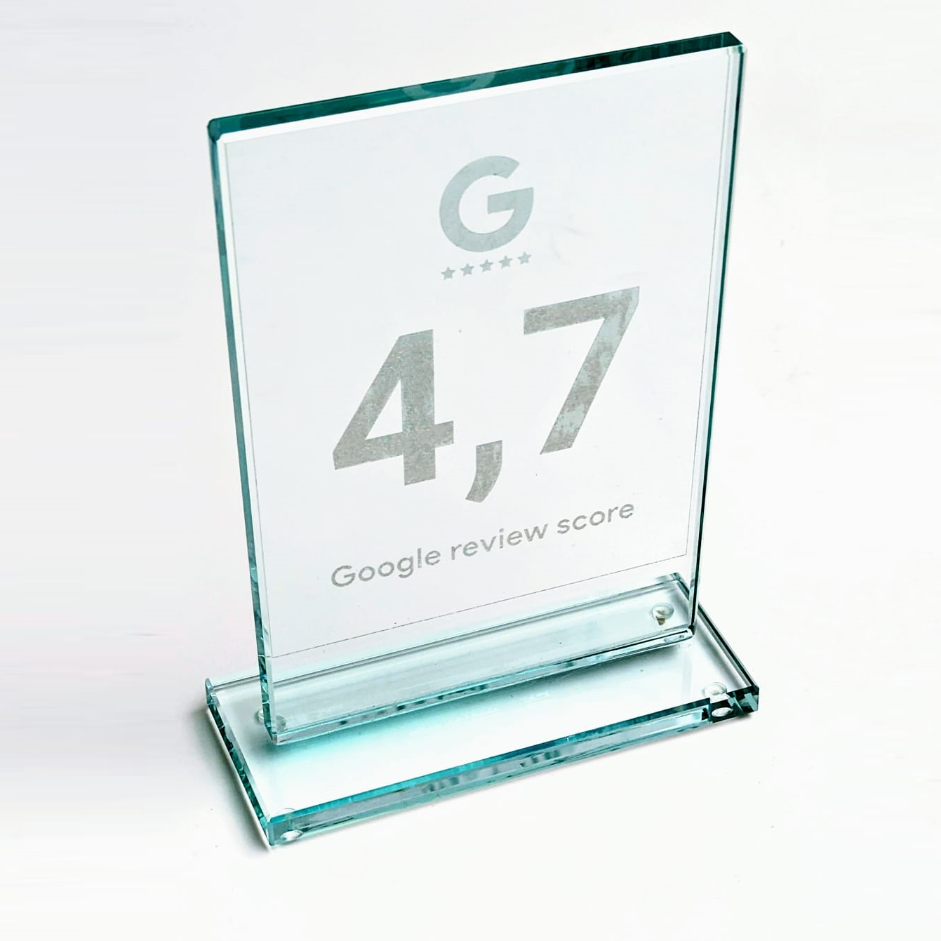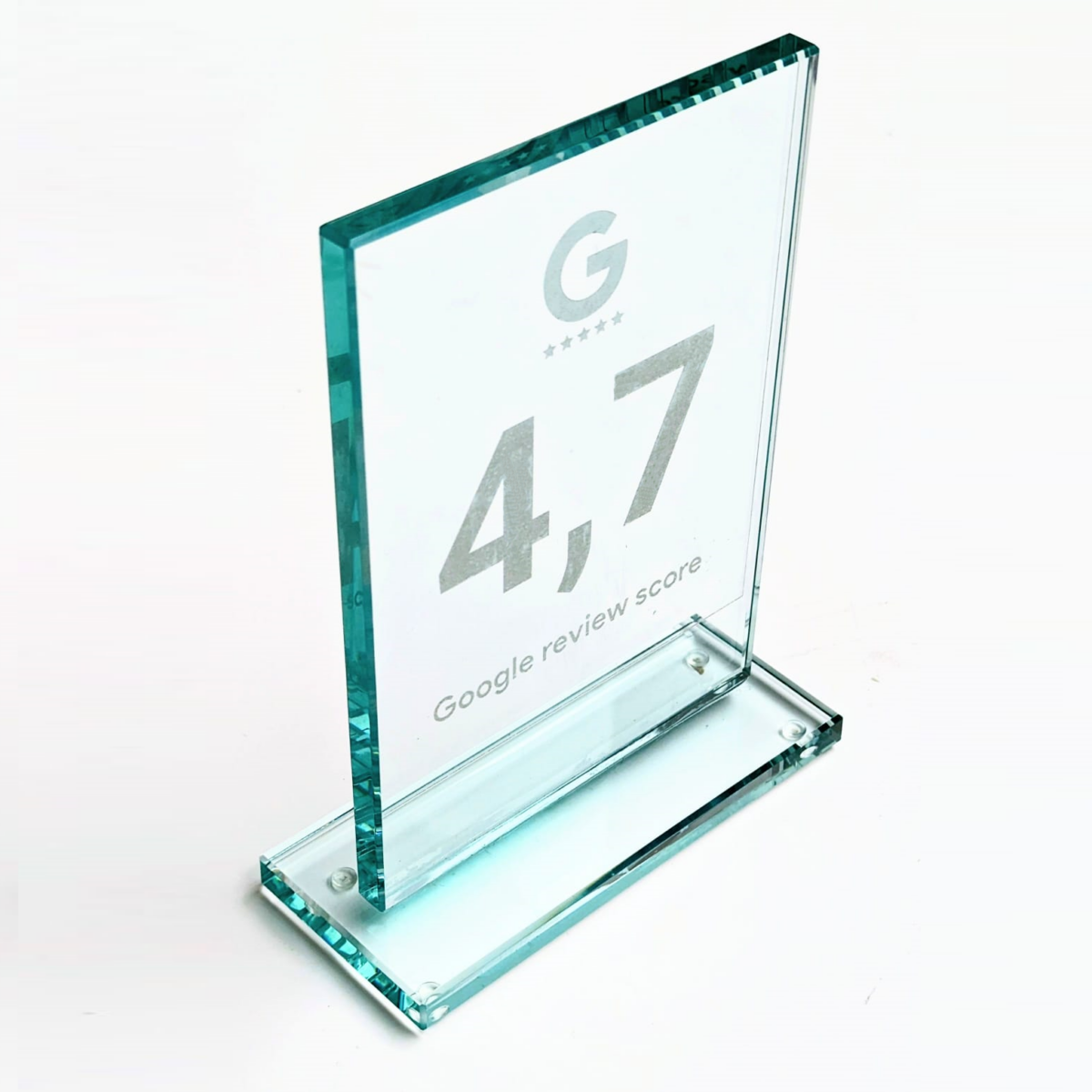 Erhalte mehr Vertrauen von deinen Kuden, Gästen und Patienten mit unseren Trust Aufstellern / Trophäen mit deinem Bewertungsscore.