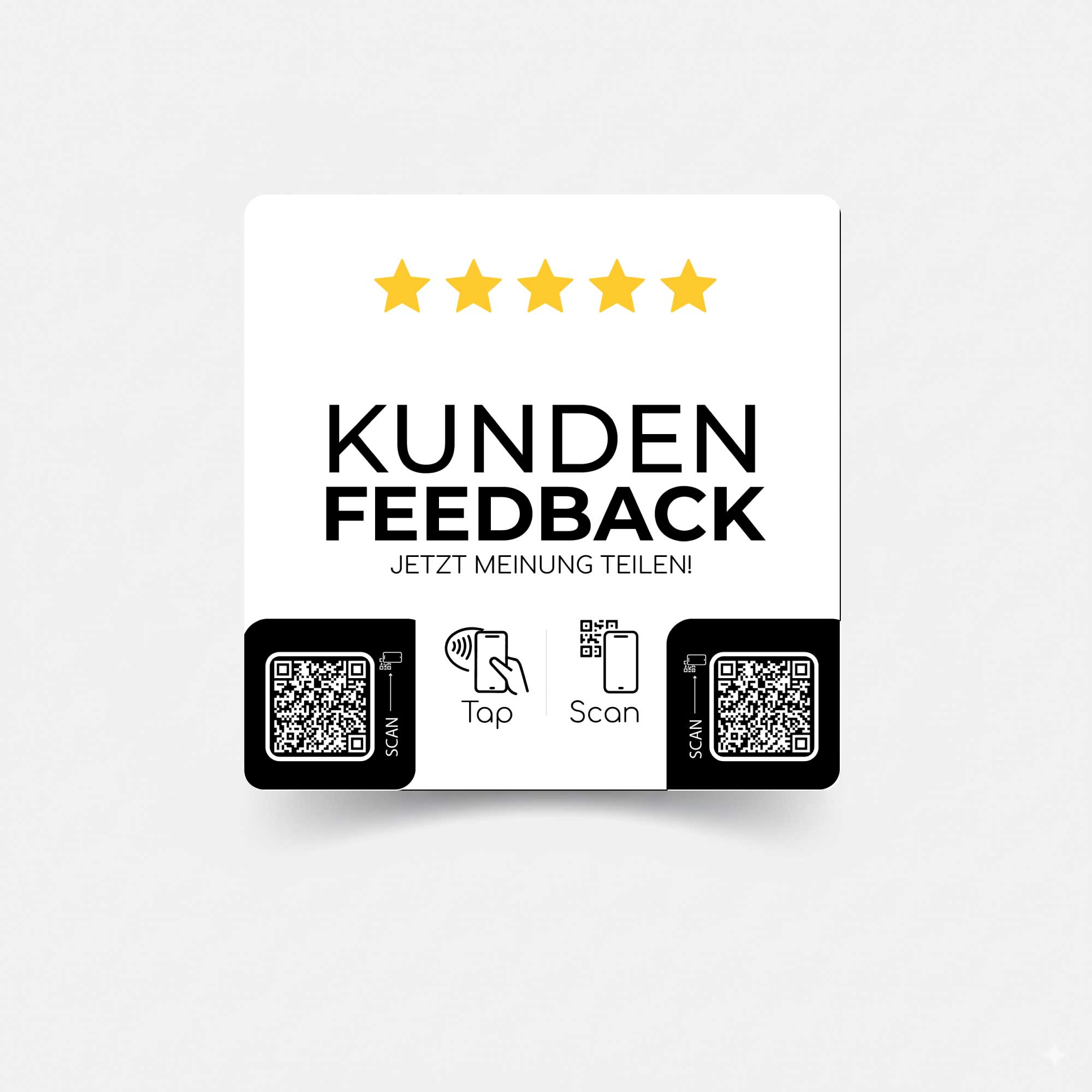 Der Kunden Feedback Sticker mit NFC & QR-Code ist die einfachste Lösung, um mehr Bewertungen zu erhalten. Ob im Laden, an der Kasse, im Wartebereich oder direkt auf Verpackungen – platziere den Sticker dort, wo Kunden ihn sehen, und sie können sofort ihr Feedback abgeben.