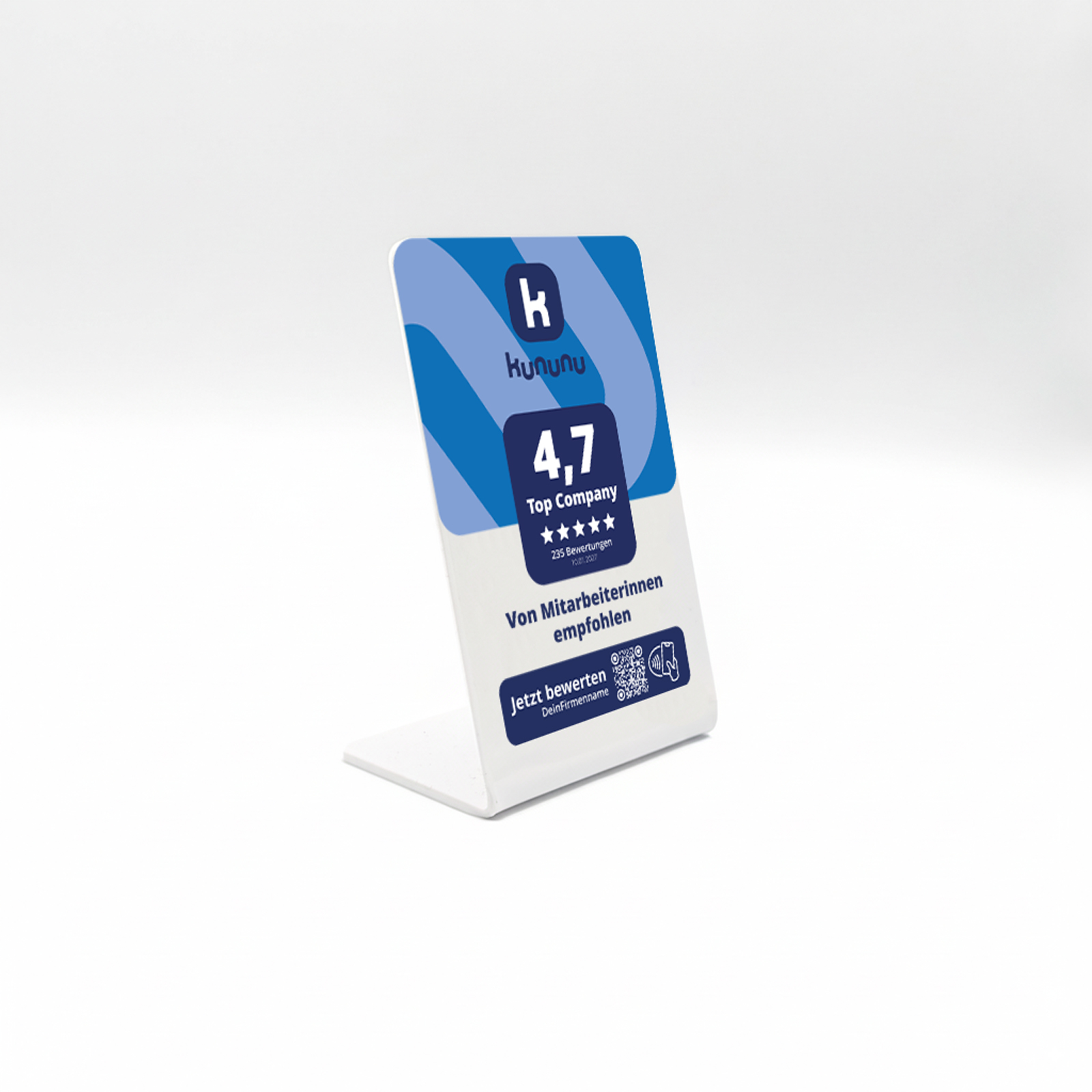 Kununu ist die führende Plattform für Arbeitgeberbewertungen. Unternehmen mit sichtbarem Score und positiven Mitarbeiterempfehlungen genießen mehr Vertrauen bei Bewerbern und Fachkräften. Mit dem Score-Aufsteller kombinierst Du Employer Branding mit einer klaren Aufforderung zur Bewertung – genau dort, wo Du mit Mitarbeitern oder Bewerbern in Kontakt kommst.