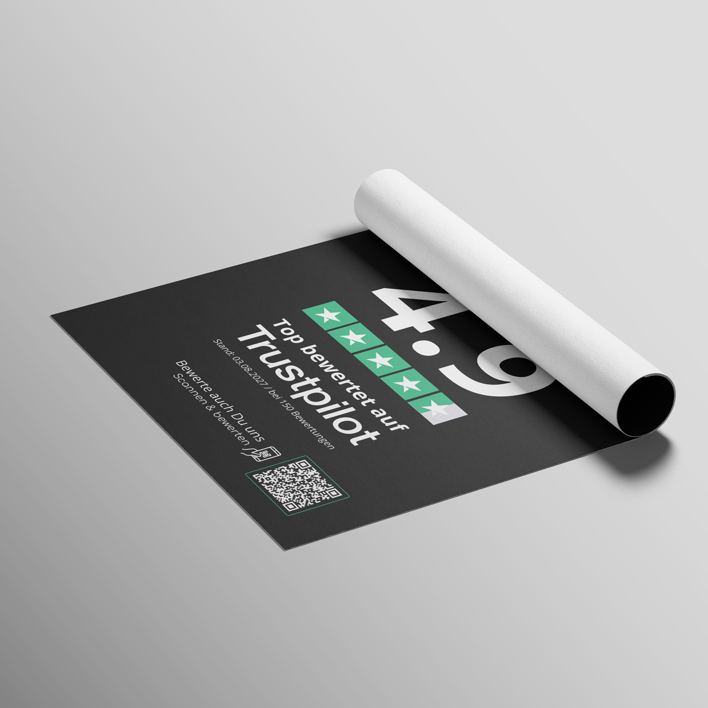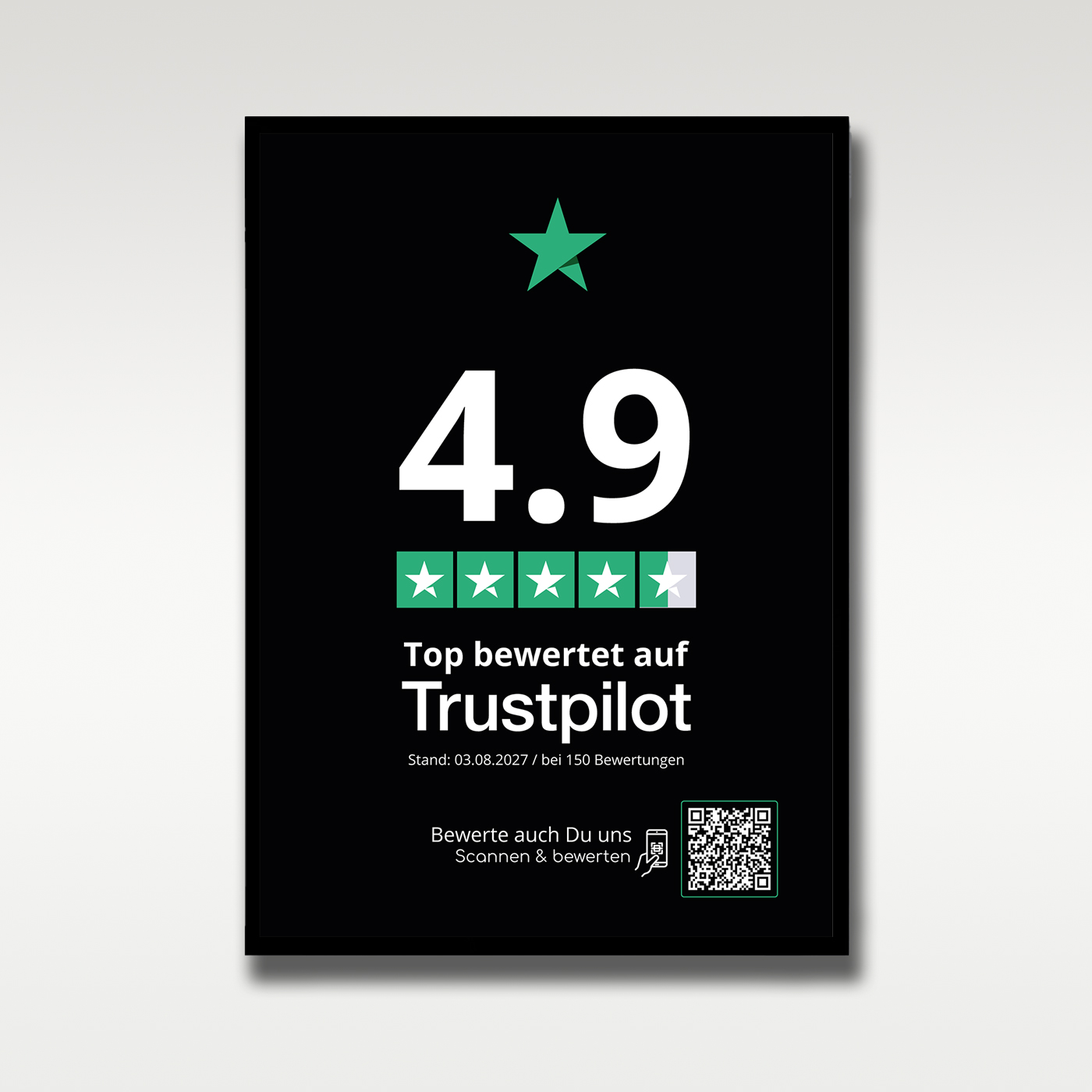 Trustpilot zählt zu den bekanntesten Bewertungsplattformen weltweit. Unternehmen mit vielen positiven Rezensionen genießen höheres Vertrauen, steigern ihre Sichtbarkeit und gewinnen mehr Neukunden. Mit einem Poster kombinierst Du eine starke visuelle Präsenz mit einem einfachen Zugang zum Feedback.