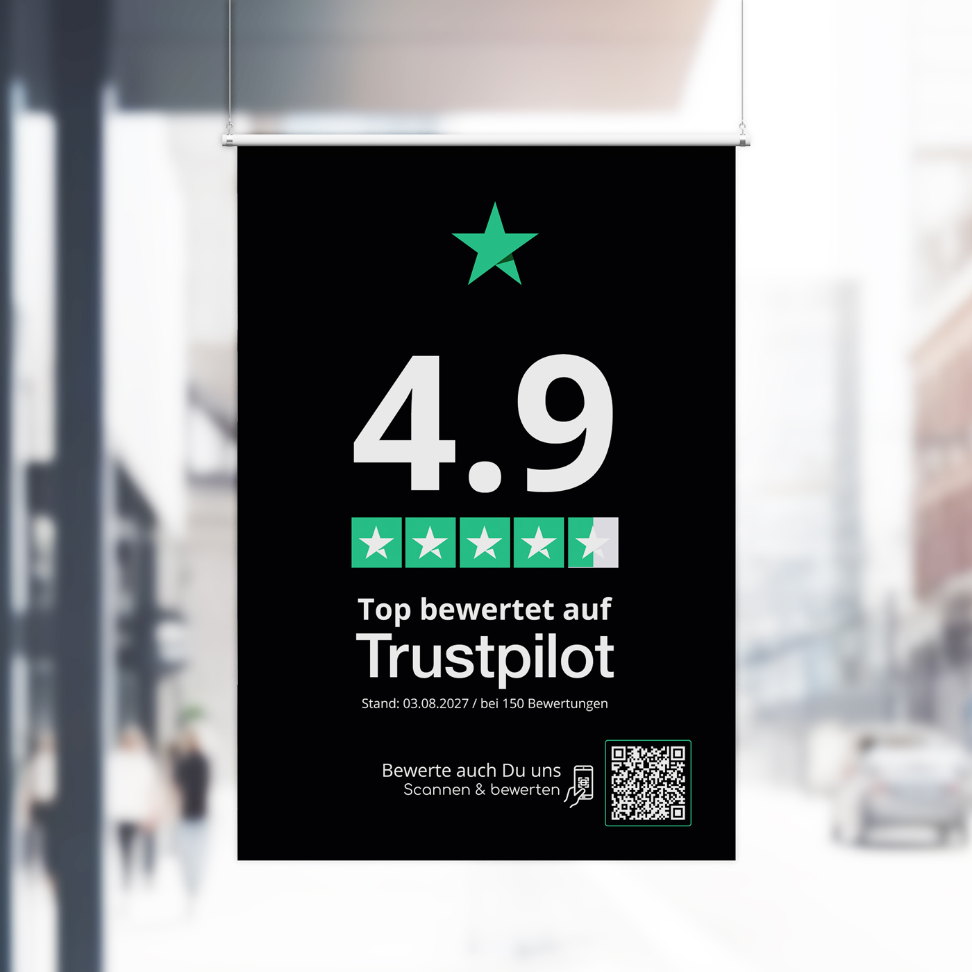 Mit dem Trustpilot Poster mit QR-Code stärkst Du Dein Bewertungsmarketing sichtbar und gewinnst mehr authentische Kundenstimmen.