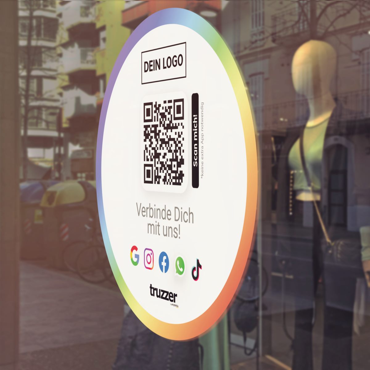 Verbinde dein Unternehmen offline mit allen wichtigen Profilen online mit der Kombination aus den truzzer Stickern mit QR Code Link und deinem truzzer Profil, auf welchem deine Kundinnen / Kunden all deine wichtigen Profile mit Direktlink finden. Somit machst Du dein Unternehmen digital nur einen QR Code Scan entfernt und du erhältst spielend leicht mehr Instagram Follower, mehr Google Bewertungen, mehr Anfragen und vieles, vieles mehr!
