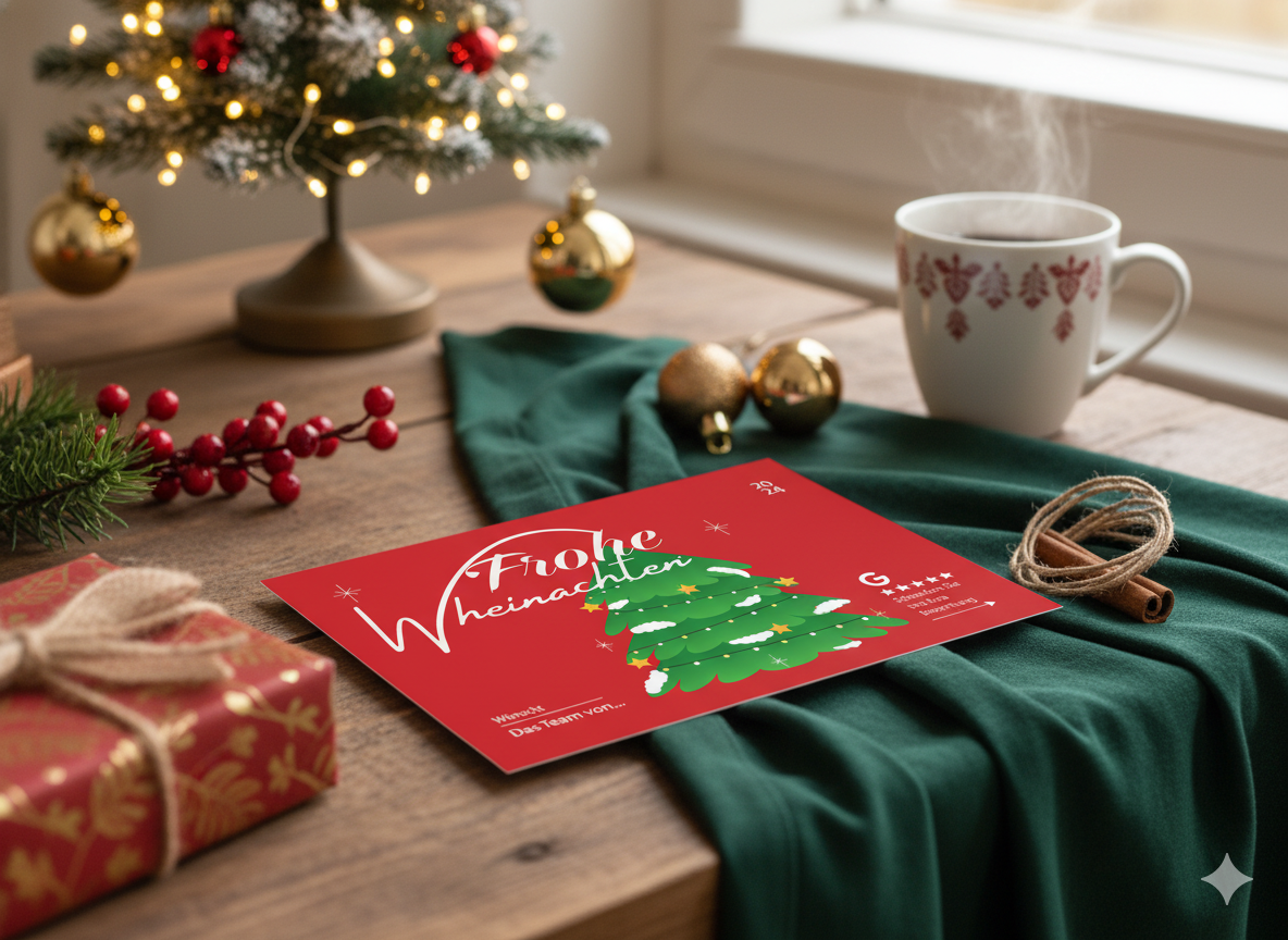- Vorderseite: Festlicher Gruß mit Weihnachtsbaum & Firmenname